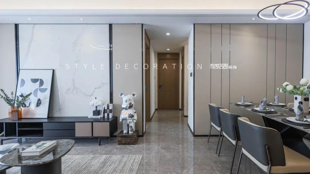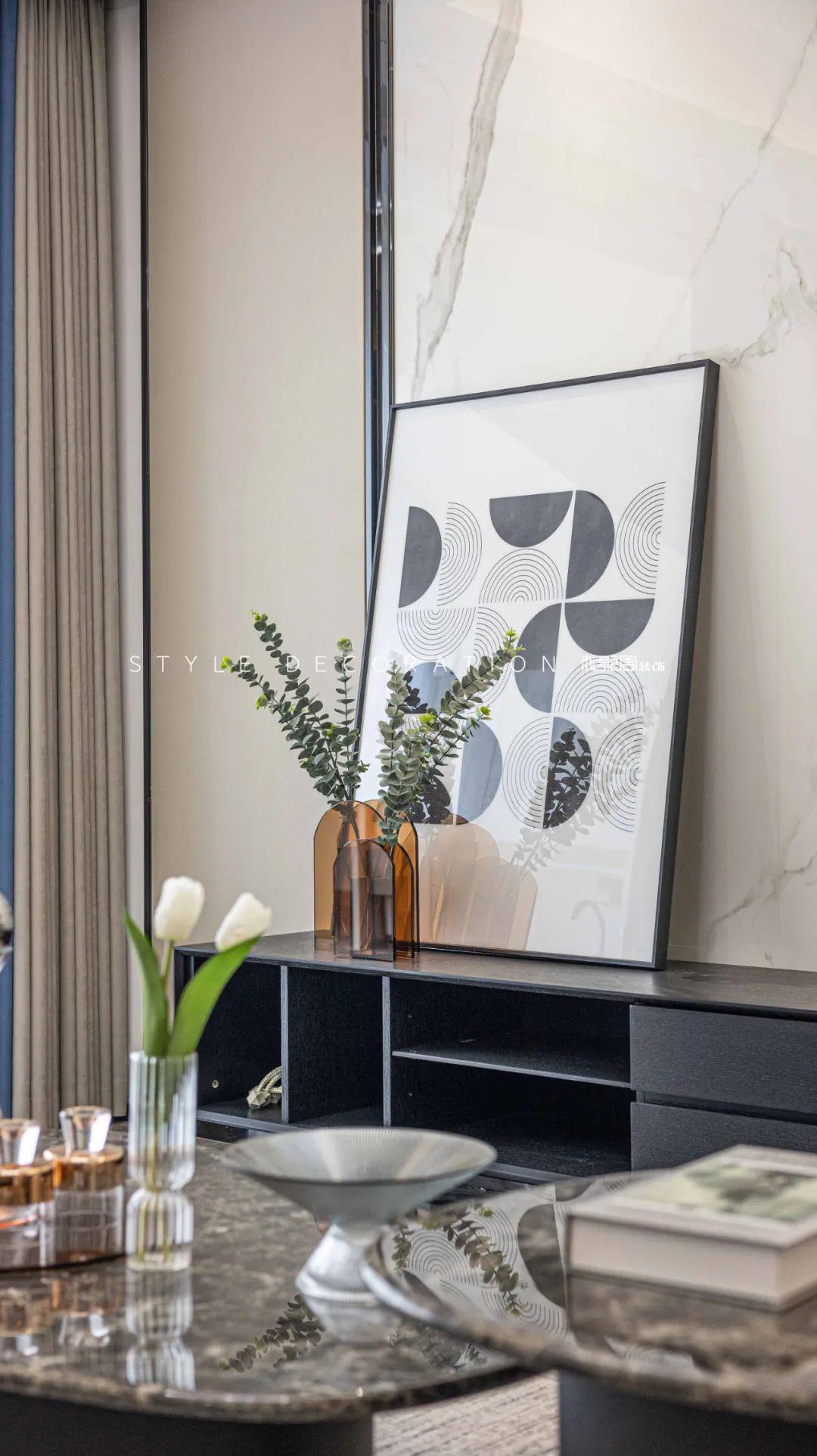 深灰色木飾面板裝飾背景,定制電視柜和白色大理石紋地臺,豐富了設計的層次感,提升了空間整體的裝飾格調。