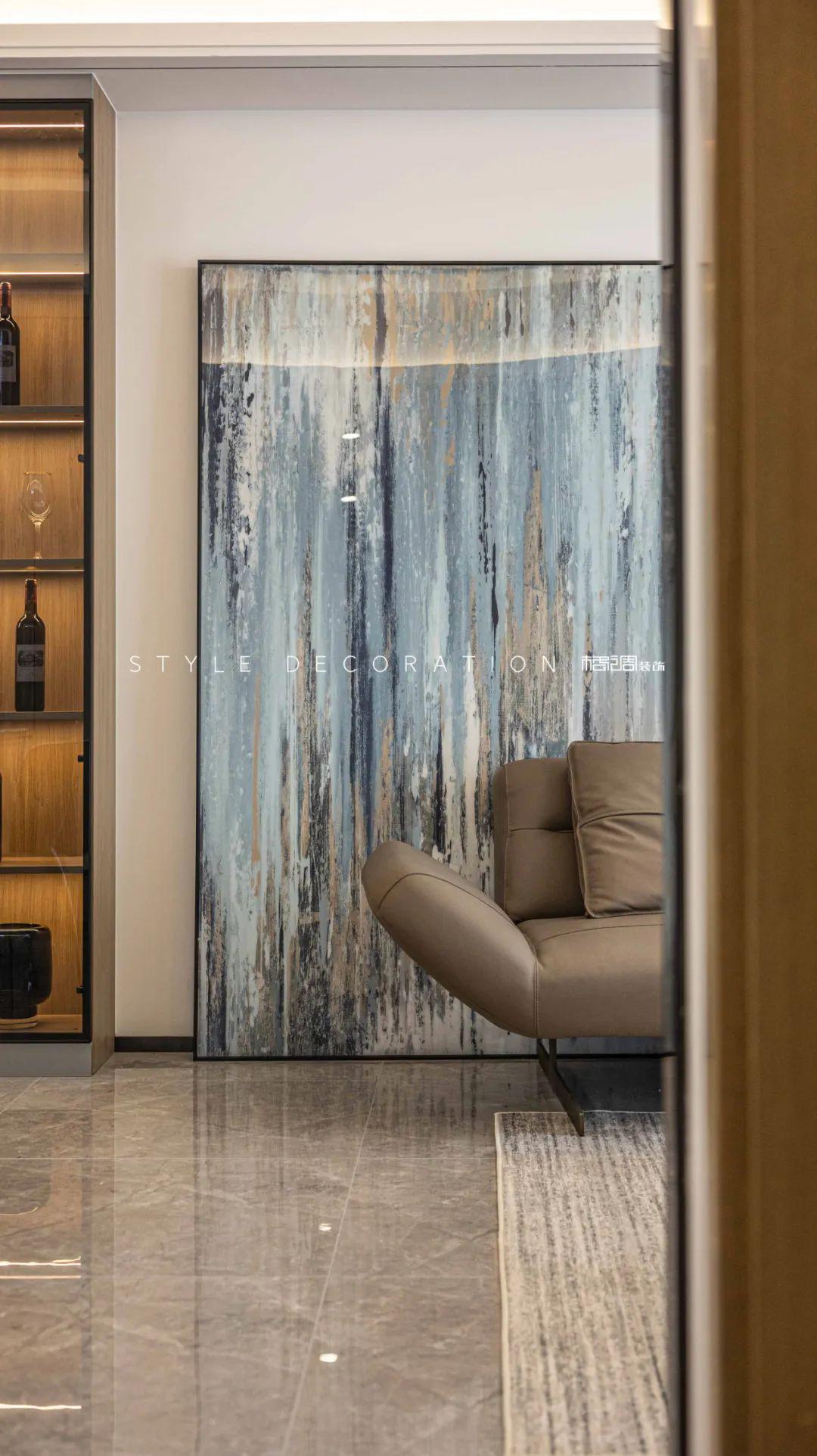 客廳采用現(xiàn)代簡約的設計,拆掉原沙發(fā)背景用雅灰色乳膠漆滿刷,氣質得到了提升。灰白色調的抽象主義掛畫,搭配咖色沙發(fā),簡單的陳設渲染了家的文藝氣質。