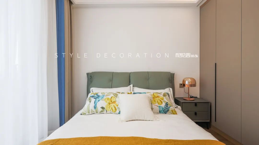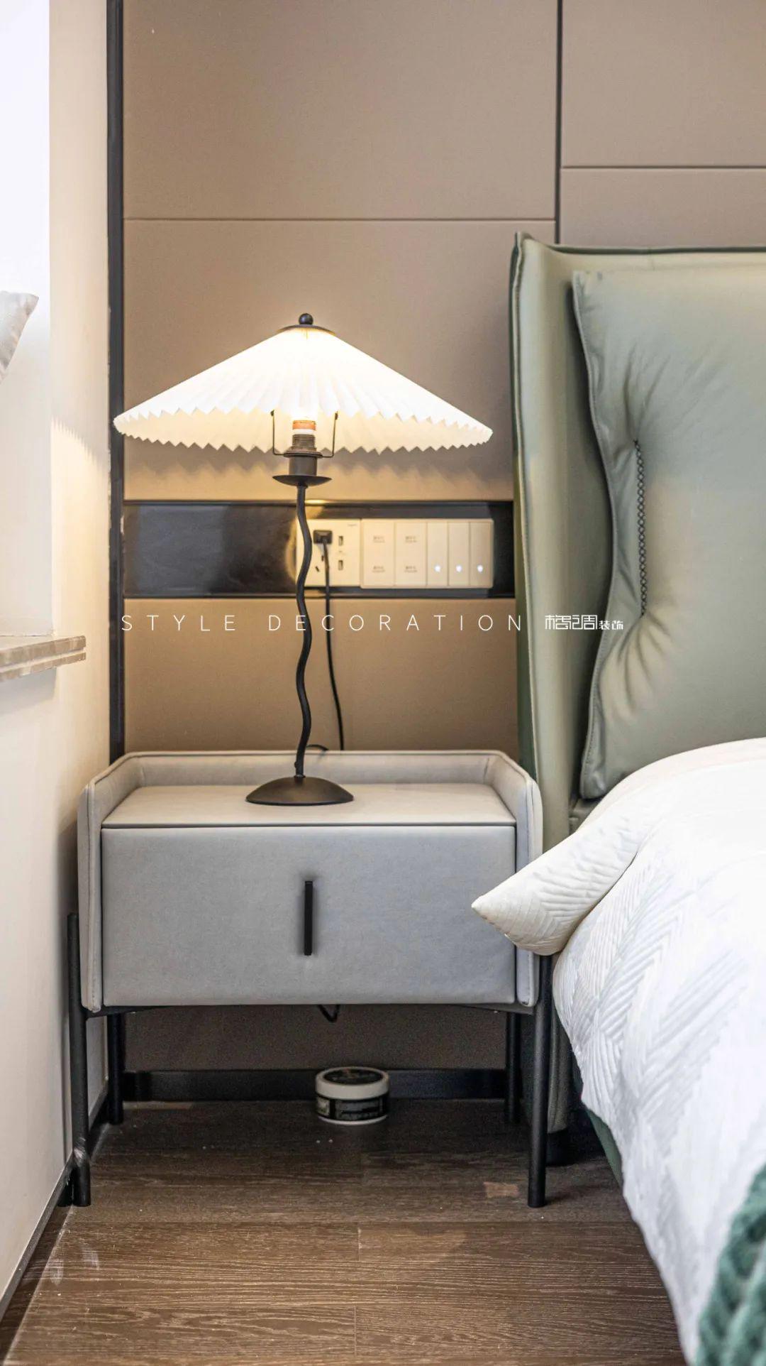 主臥背景墻同樣木飾裝飾材料,強化了背景墻的整體感,放大了空間的視覺寬度。